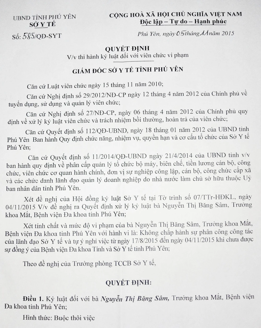 Ngày 15-11, ông Phan Vũ Nhân, Giám đốc Sở Y tế tỉnh Phú Yên, xác nhận đã ký ban hành quyết định kỷ luật bằng hình thức buộc thôi việc đối với ThS-BS Nguyễn Thị Băng Sâm, Trưởng khoa Mắt BV Đa khoa tỉnh này, do không chấp hành sự phân công công tác của lãnh đạo Sở Y tế, tự ý nghỉ việc khi chưa được sự đồng ý của BV Đa khoa tỉnh, Sở Y tế.