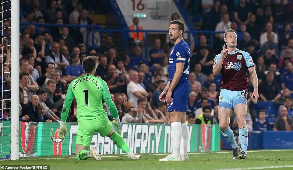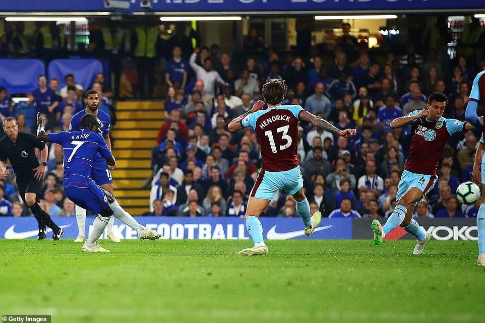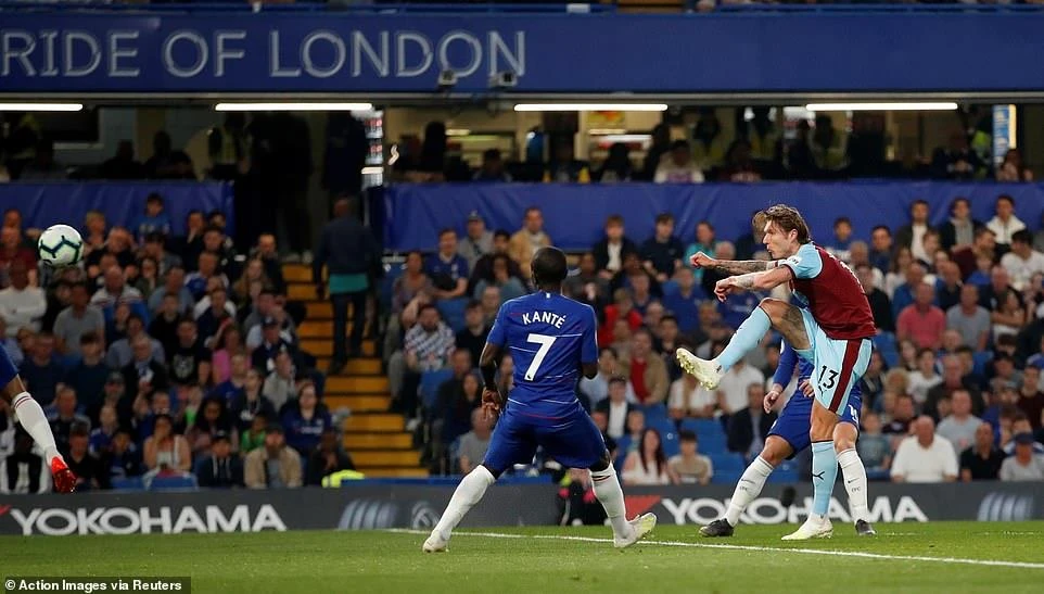 Nếu như Chelsea tấn công hay đẹp mắt thì Burnley lại gây bất ngờ với bàn thắng vươn lên dẫn trước ở phút thứ 8. Từ tình huống phạt góc hậu vệ của Chelsea phá bóng không quyết liệt, bóng tìm đúng vị trí của tiền vệ Jeff Hendrick, số 13 của Burnley tự tin tung cú “nã đại bác” đánh bại thủ môn Kepa mở tỉ số 1-0.
