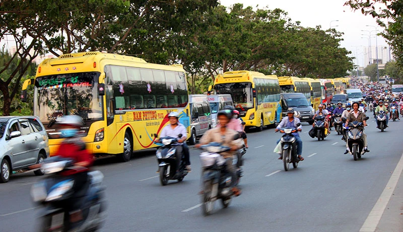 Ngày 5-3, theo ghi nhận của phóng viên, tại đại lộ Mai Chí Thọ (quận 2), các nhà xe như Toàn Thắng, Hoa Mai, Phương Nam, Việt Nhật, Hạnh Cafe,... lập “bến mới “ để đón, trả khách rất nhộn nhịp, kéo dài từ đầu hầm Thủ Thiêm đến ngã ba Trần Văn Khê - Mai Chí Thọ.