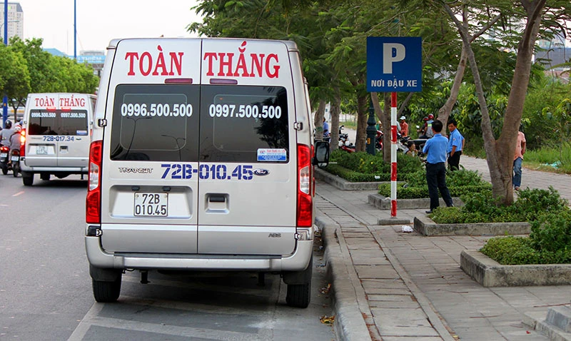 Dòng xe di chuyển qua đây phải căng mắt tránh các xe trung chuyển của hãng Toàn Thắng và các hãng khác thả khách xuống giữa đường. Ảnh: HOÀNG GIANG