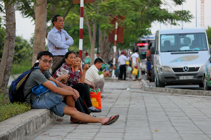 Hành khách ngồi chờ xe trên đường Mai Chí Thọ. Ảnh: HOÀNG GIANG