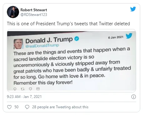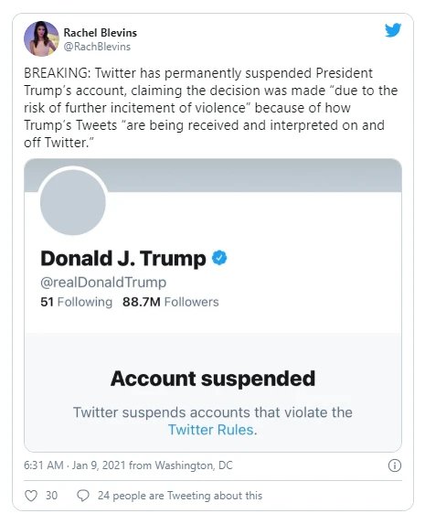"Trong bối cảnh các sự kiện kinh hoàng xảy ra trong tuần này, chúng tôi đã nói rõ hôm 6-1 rằng những vi phạm xét theo quy tắc của Twitter sẽ dẫn đến kết quả này. Chúng tôi đã làm rõ trong nhiều năm trở lại đây rằng không thể sử dụng Twitter để kích động bạo lực. Chúng tôi sẽ tiếp tục minh bạch về các chính sách của mình và việc thực thi chúng" - Twitter đưa ra tuyên bố trên trang của mình.