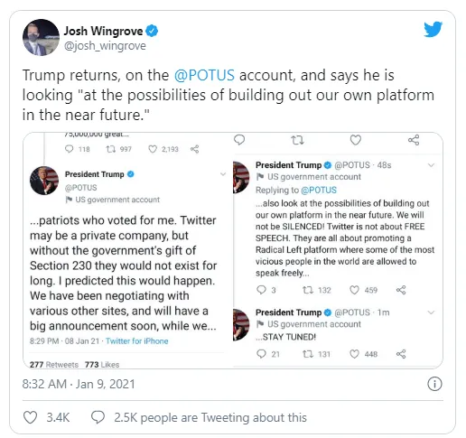 Tổng thống Trump sau đó đã đáp trả lại lệnh cấm của Twitter thông qua tài khoản của chính phủ Mỹ @POTUS, khẳng định ông sẽ không "im lặng" trước khi các bài đăng này ngay lập tức bị xóa khỏi nền tảng này.
