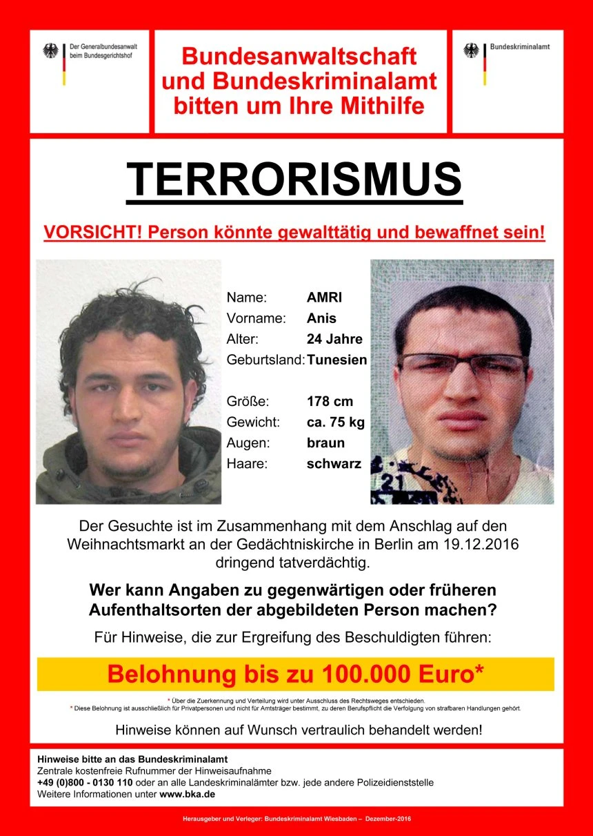 Nghi phạm số một hiện nay là người đàn ông 24 tuổi, cao 1,78 m, có tên Anis Amri, người Tunisia.