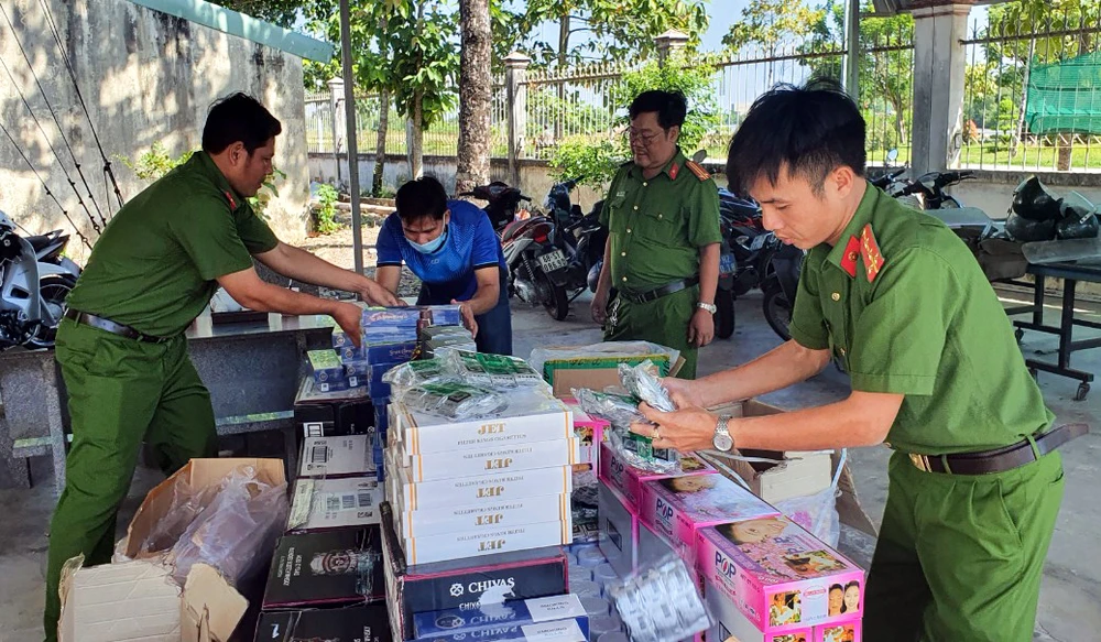 Công an TP Hà Tiên đã thu giữ tại hiện trường một vỏ máy có công suất lớn, hơn 7.700 lọ mỹ phẩm, khoảng 2.000 bao thuốc lá ngoại và 360 chai rượu ngoại. Ước tính tổng số giá trị tài sản khoảng 400 triệu đồng.