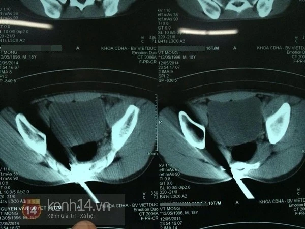 Sau khi được đưa vào viện, bệnh nhân đã được các bác sĩ điều trị và tiến hành mổ cấp cứu. Hình ảnh chụp phim cắt lớp cho thấy đầu nhọn của dị vật đã xuyên qua xương cùng ra tận thành trước, tuy nhiên, rất may là không bị thủng trực tràng.