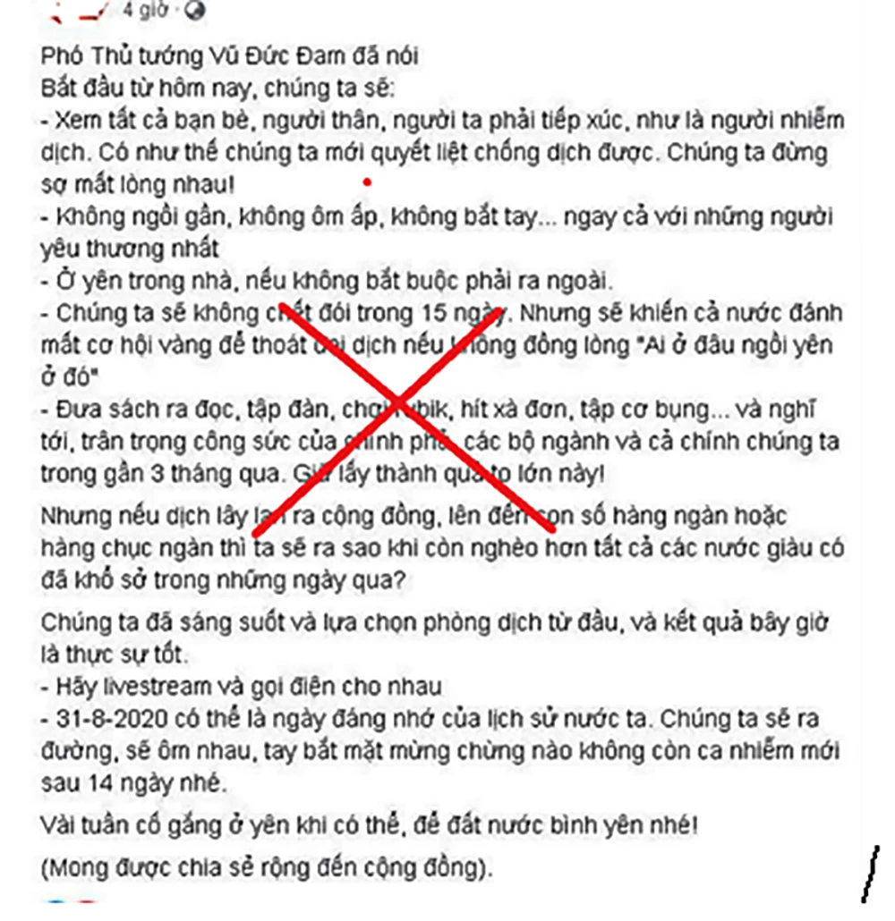 Trước đó, ngày 2-8, ông V. chia sẻ trên Facebook cá nhân của mình lời kêu gọi mọi người chung tay phòng, chống dịch Covid-19 của Phó Thủ tướng Vũ Đức Đam. Tuy nhiên thông tin này là giả mạo.
