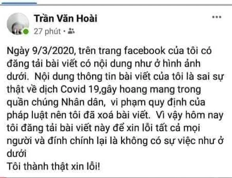 Tại cơ quan công an, bước đầu Trần Văn Hoài đã thừa nhận hành vi của mình, đã tự gỡ bài viết và công khai xin lỗi trên Facebook cá nhân về các hành vi của mình.