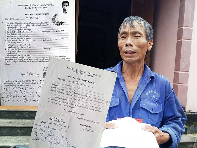 Sau khi xuất ngũ trở về địa phương, anh Trung cũng làm hồ sơ thủ tục xin việc làm và đi xuất khẩu lao động ở nước ngoài. Ngày 3-5-2017, ông Quyết cũng ghi trong đơn xác nhận dân sự của anh Trung là: “Nguyễn Đình Trung (SN 1997) chưa có tiền án, tiền sự gì, gia đình chưa chấp hành tốt nghĩa vụ của địa phương” (lúc này gia đình ông Quyết đã ra khỏi hộ cận nghèo nhưng vẫn còn khoản nợ trước đó - PV).