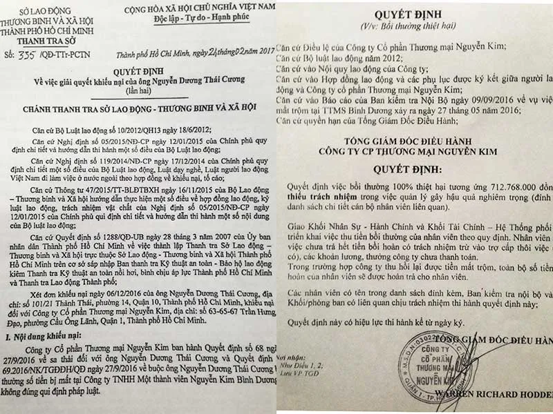 Quyết định buộc bồi thường của Công ty Nguyễn Kim và quyết định giải quyết khiếu nại của chánh Thanh tra Sở LĐ-TB&XH TP.HCM. Ảnh: PĐ