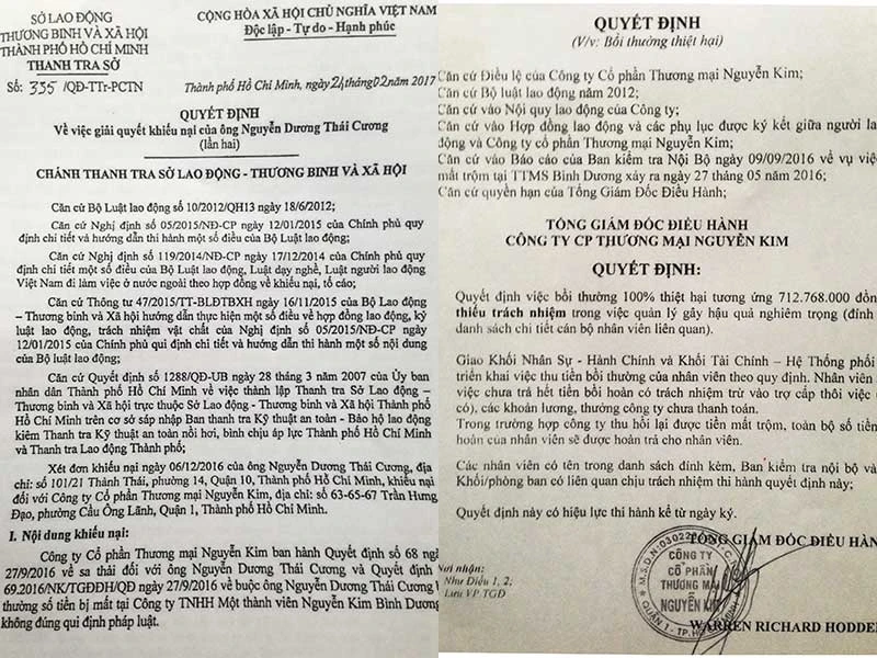 Về thẩm quyền ký quyết định xử lý kỷ luật lao động và quyết định bồi thường thiệt hại, theo kết luận Thanh tra Lao động, ông Warren Richard Hodder, Tổng Giám đốc điều hành Công ty Nguyễn Kim, được ủy quyền quản lý điều hành công ty. Vì vậy ông này không phải là người sử dụng lao động để ra hai quyết định sa thải ông C. và buộc ông C. cùng 19 nhân viên bồi thường thiệt hại.