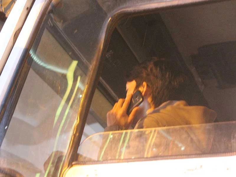 Bị xử phạt, một tài xế ngồi trên cabin gọi điện thoại cho người quen cầu cứu. Ảnh: TUYẾN PHAN
