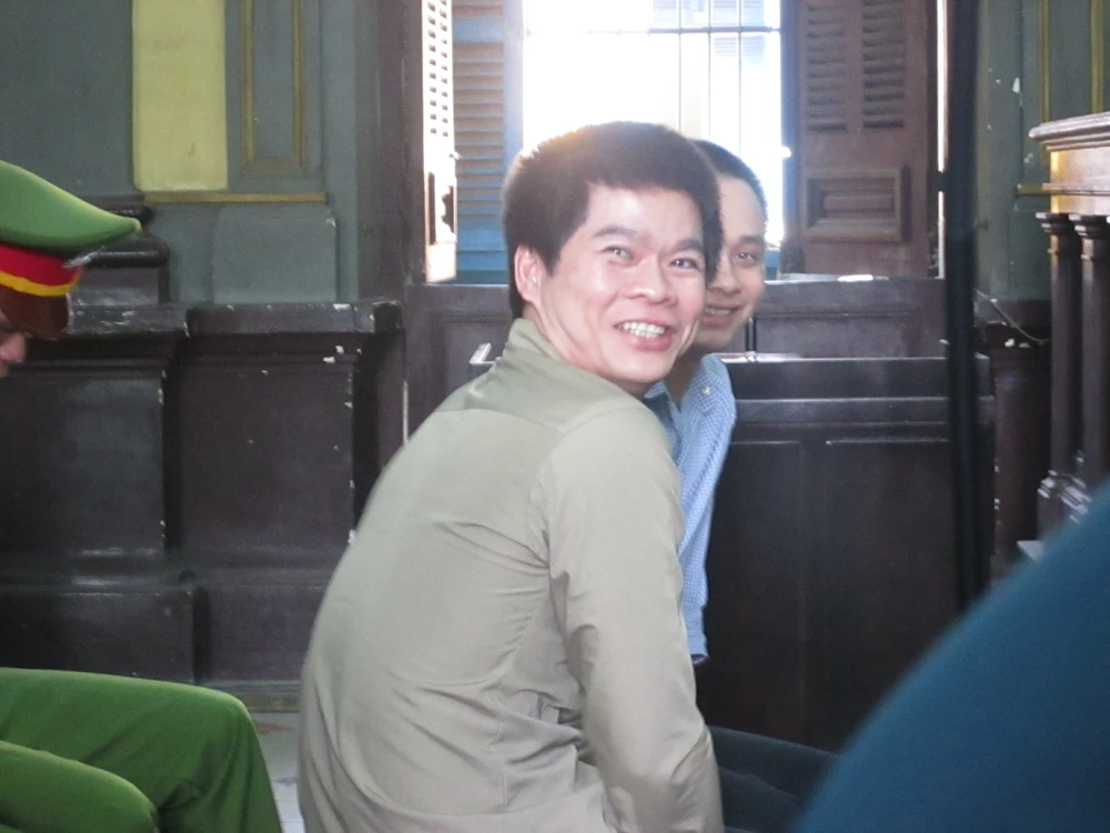 Bị cáo Lộc (bên trong) và Tài trong lúc chờ nghị án.