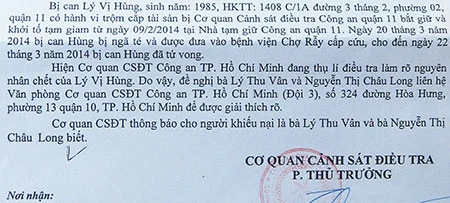 Thấy người thân có dấu hiệu bị đánh chứ không phải tự té như lý giải của công an nên gia đình khiếu nại về cái chết của Hùng. Trả lời khiếu nại của gia đình (ngày 4-4), Công an quận 11 nêu: “Ngày 20-3, Hùng bị ngã té và được đưa vào BV Chợ Rẫy cấp cứu. Ngày 22-3 thì Hùng chết. Hiện Công an TP.HCM đang thụ lý điều tra làm rõ nguyên nhân chết của Hùng”.