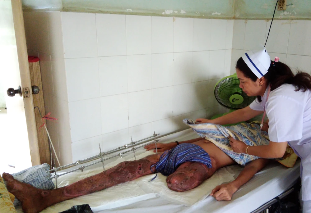 Anh T. là công nhân một xưởng gỗ ở Bình Dương. Tháng 3-2017, khi anh đang lui cui làm sạch máy bào gỗ thì bạn bè đến rủ ăn trưa. Bất ngờ một người bạn bấm nút đỏ trên bảng điều khiển làm máy bào khởi động, tai nạn không may xảy ra khiến vùng hạ chân trái của anh tổn thương nặng nề. Chưa hết, hai chân cũng bị lột gần hết da.