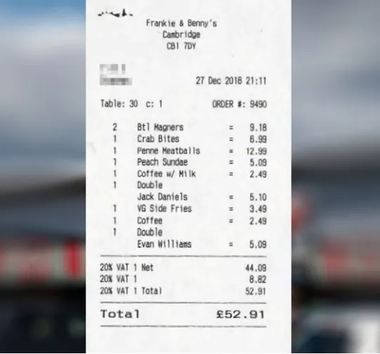 Số là hồi tháng 12 năm ngoái, Rockett đến ăn tại nhà hàng Frankie & Benny, ở TP Cambridge (Anh) từ 4 giờ chiều cho đến khoảng 11 giờ đêm.