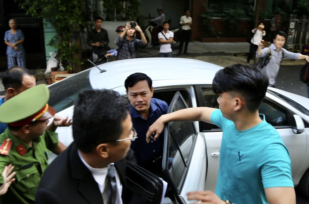 Lực lượng bảo vệ ông Linh hỗ trợ ông bước vào tòa. Ảnh: HUỲNH TRƯỜNG GIANG
