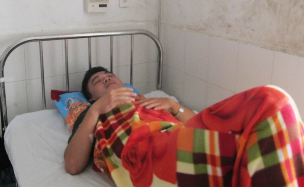 Trung úy Nguyễn Thành Trung bị đa chấn thương, dập lá lách, đang cấp cứu tại BV Đa khoa Phú Yên. Ảnh: TẤN LỘC