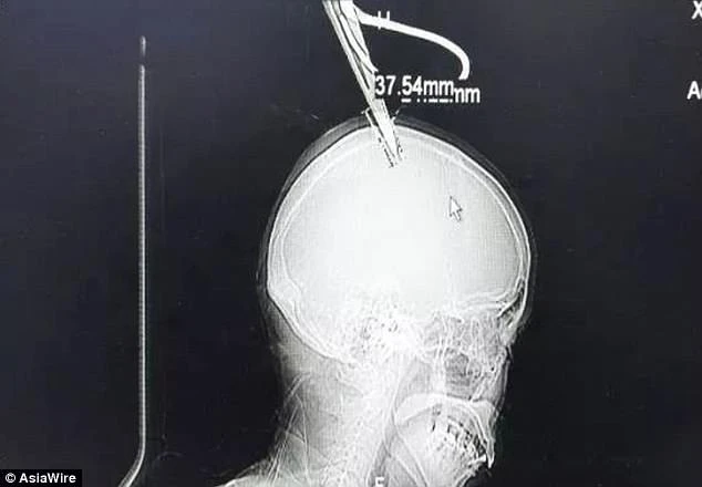 Hình ảnh chụp X-quang chiếc kéo đâm xuyên đầu.