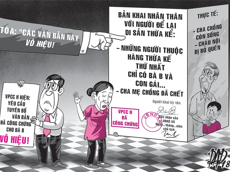 Như vậy, bản khai trên đã không khai hai người được thừa kế di sản của chồng bà B. là cha ruột và người thừa kế thế vị của con trai vợ chồng bà B. Điều này cũng có nghĩa văn bản phân chia di sản thừa kế mà VPCC lập ngày 11-5-2017 đã bỏ sót hai người này.