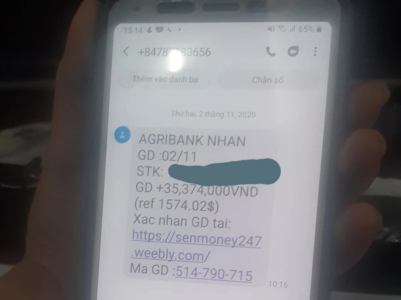 Vài phút sau, điện thoại chị T. nhận được tin nhắn từ số điện thoại 0787583xxx với nội dung thông báo tài khoản của chị nhận được hơn 35 triệu đồng và để xác nhận giao dịch phải vào đường link https://senmony247.weebly.com.