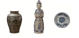 Từ trái qua: Bình hoa lam vẽ thiên nga (Bảo vật quốc gia); Tượng nữ quý tộc; Đĩa men trắng, vẽ lam (Gốm, thế kỷ XV), khai quật Tàu đắm cổ Cù Lao Chàm, Hội An, Quảng Nam 1997- 2000. Ảnh: website Bảo tàng lịch sử quốc gia.