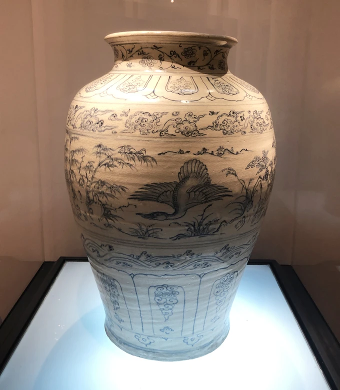 Bình gốm hoa lam vẽ thiên nga là hiện vật có kích thước lớn nhất và nguyên vẹn nhất được khai quật trong tàu đắm tại Cù Lao Chàm. Chiếc bình đã được công nhận là Bảo vật quốc gia năm 2012. Thời điểm phát hiện, con tàu nằm ở độ sâu 70-72 m dưới biển. Phần thuyền còn lại dài 29,4 m, rộng 7,2 m. Việc khai quật được tiến hành trong 3 năm (1997-2000) với 240.000 hiện vật được trục vớt. Ảnh: VNE