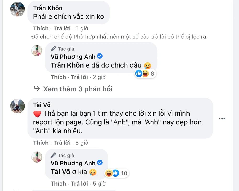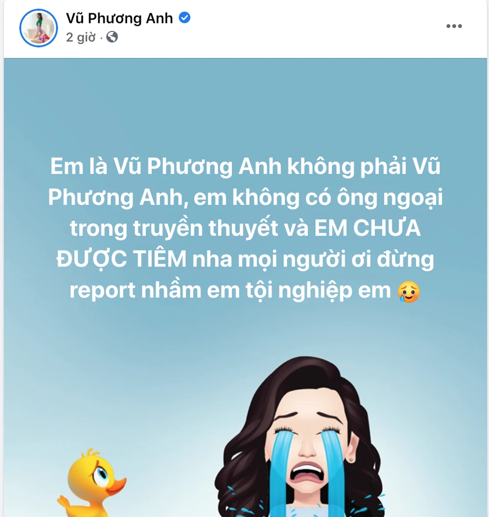 Cách đây vài tiếng, nữ diễn viên Gái già lắm chiêu đã phải đính chính trên trang cá nhân rằng: “Em là Vũ Phương Anh không phải Vũ Phương Anh, em không có ông ngoại trong truyền thuyết và EM CHƯA ĐƯỢC TIÊM nha mọi người ơi, đừng report nhầm em tội nghiệp em”.