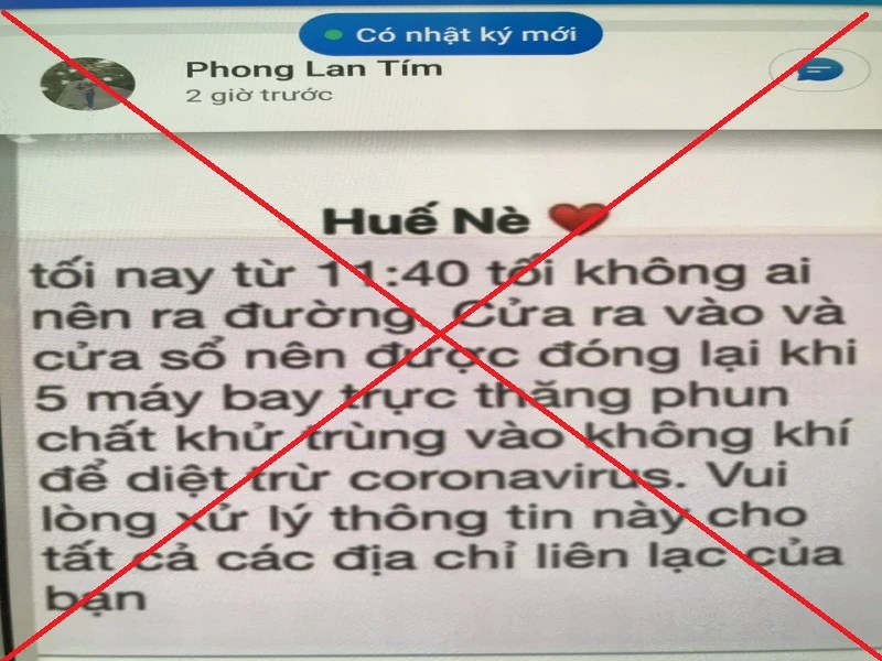 Theo đó, vào 9 giờ 30 ngày 30-3, bà Cúc chủ tài khoản Zalo Phong Lan Tím đã đăng tải lên mạng xã hội này với nội dung: "Tối nay từ 11:40 tối không ai nên ra đường. Cửa ra vào và cửa sổ nên được đóng lại khi 5 máy bay trực thăng phun chất khử trùng vào không khí để diệt trừ coronavirus".