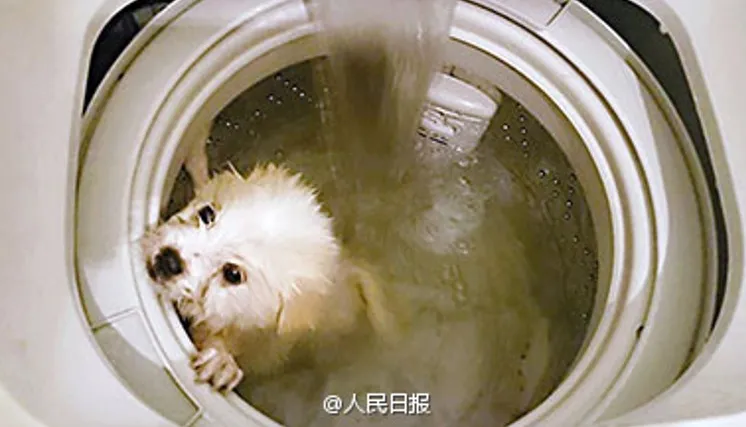 Một hình ảnh được đăng tải lên Facebook của Jacky Lo về một chú chó trắng đang cố gắng trèo ra khỏi buồng khuấy của máy giặt.