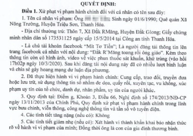 Sở TT&TT tỉnh Đắk Nông vừa có quyết định xử phạt hành chính đối với ông HST (SN 1990, trú tại xã Đăk RMãng, huyện Đăk Glong, Đắk Nông) số tiền 10 triệu đồng về hành vi đăng thông tin sai sự thật gây hoang mang dư luận.