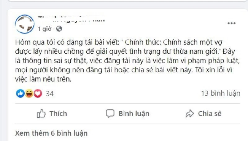 Theo đó, vào lúc 14 giờ ngày 2-3, bà Ng. đã đăng tải, chia sẻ nội dung thông tin từ một trang web có địa chỉ Baocuti.com với nội dung: "Chính thức: Chính sách một vợ được lấy nhiều chồng để giải quyết tình trạng dư thừa nam giới" lên trang facebook cá nhân mình.