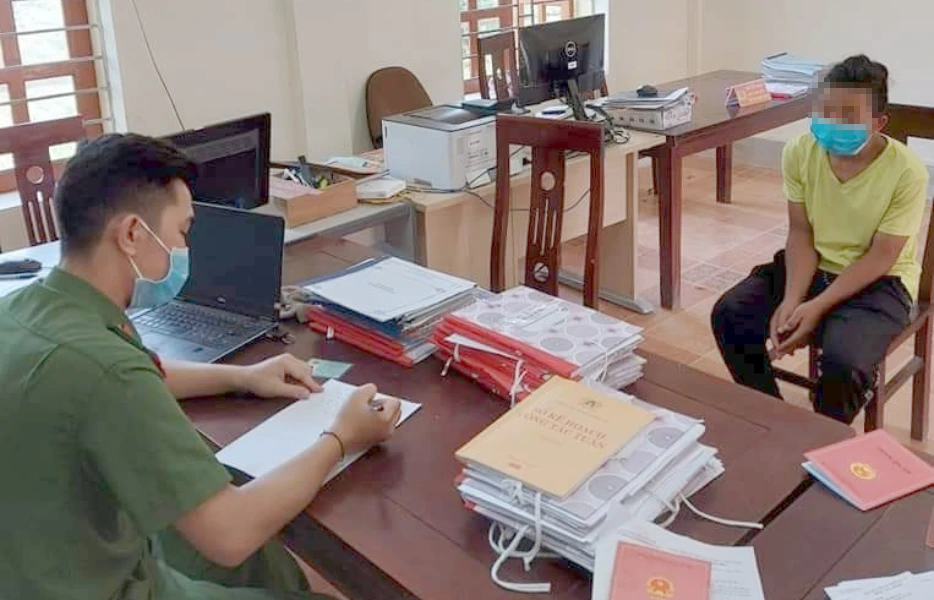 Công an xã Bảo Thắng làm việc với anh M. Ảnh: CA