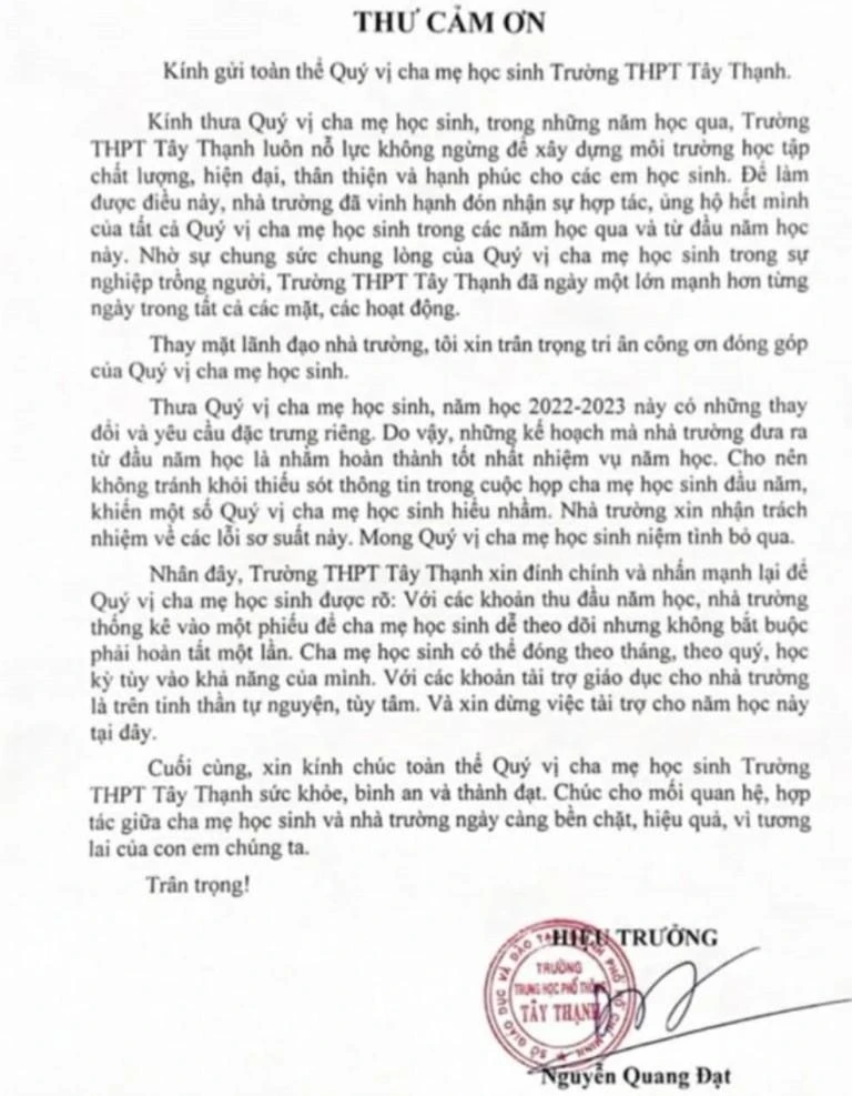 Nội dung bức thư như sau: “Năm học 2022-2023 này có những thay đổi và yêu cầu đặc trưng riêng. Do đó, những kế hoạch mà nhà trường đưa ra từ đầu năm học là nhằm hoàn thành tốt nhất nhiệm vụ năm học. Cho nên không tránh khỏi thiếu sót thông tin trong cuộc họp cha mẹ học sinh đầu năm khiến một số quý vị cha mẹ học sinh hiểu nhầm. Nhà trường xin nhận trách nhiệm về các lỗi sơ suất này. Mong quý vị cha mẹ học sinh niệm tình bỏ qua. Nhân đây, trường THPT Tây Thạnh xin đính chính và nhấn mạnh lại để quý vị cha mẹ học sinh được rõ: “Với các khoản thu đầu năm học, nhà trường thống kê vào một phiếu để cha mẹ học sinh dễ theo dõi nhưng không bắt buộc phải hoàn tất một lần. Cha mẹ học sinh có thể đóng theo tháng, theo quý, học kỳ tuỳ theo khả năng của mình. Với các khoản tài trợ giáo dục cho nhà trường là trên tinh thần tự nguyện, tuỳ tâm. Và xin dừng việc tài trợ cho năm học này tại đây”.