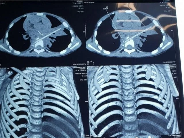 Hình ảnh chụp vi tính cắt lớp sau đó cho thấy bệnh nhi có một dị vật dài nhọn kích thước 72x4 mm tại vị trí nhu mô thùy phổi ở thùy giữa phổi phải. Dị vật này đi từ trước ra sau, xuyên qua khe giữa hai thân đốt sống 6, 7 và làm vỡ thân đốt sống. Khi nằm lại trong cơ thể, dị vật gây phản ứng thâm nhiễm viêm trung thất sau quanh đốt sống 6, 7. Đây cũng là nguyên nhân khiến bé M. phải vào viện điều trị viêm phổi trong suốt tám tháng.