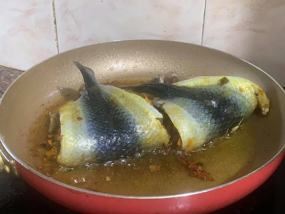 Sau đó thì chỉ việc gấp lại và chiên, chiên cháy cạnh mặt này thì lật mặt kia; con cá đã được bẻ nhiều đốt sẽ không còn ỏng ẹo cong lên cong xuống làm đổ các phụ liệu nén trong ruột. Bếp lửa chiên phải vừa vừa lửa để cá không cháy ngoài mà sống trong; từ từ lấy cái kẹp hoặc đôi đũa lăn qua lật lại cho cá chín đều rồi từ chín đều tới giòn cháy cạnh.