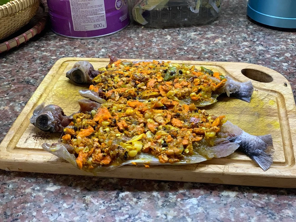 Nguyên liệu nén trong ruột cá được bằm nhỏ, dàn đều lên mình cá. Ảnh: LƯU BÌNH