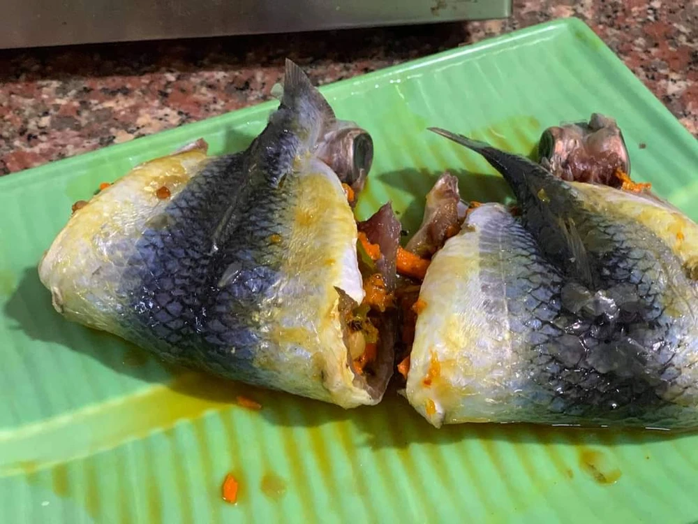 Các phụ liệu gồm nghệ nén ớt xanh trong ruột sẽ dần dần chín hơi trong ruột cá; một ít nghệ nén rơi ra ngoài sẽ làm nên món phụ liệu giòn giòn cháy cạnh là đã ăn rồi là chỉ thích ăn nó còn hơn ăn món cá chính.