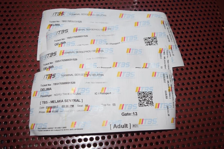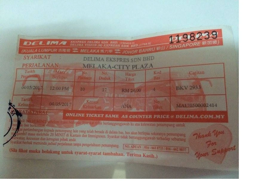 Để đến Singapore, chúng tôi đến Melaka Sentral mua vé đi Singapore của hãng Delima Ekspres BHD. Hãng xe này khoảng 1 tiếng có 1 chuyến từ 8 giờ sáng đến 24 giờ. Một điều lưu ý là bạn nên ra đúng thời gian hoặc ra tới bến mua và đi luôn. Không nên mua trước sẽ bị trễ và phải mua vé mới. Giá vé 1 người là 26 RM (1 RM tiền Malaysia được quy đổi khoảng 5.250 VNĐ).