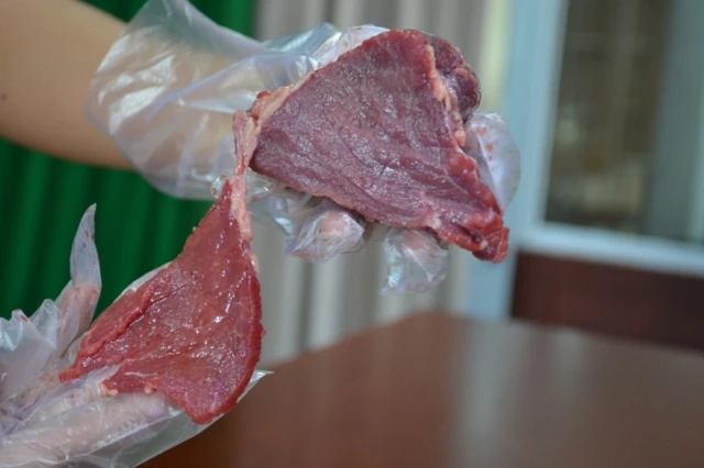 Thịt bò giả thường được làm giả màu bò bằng cách tưới huyết bò hoặc nhuộm phẩm màu, nếu nhìn qua sẽ giống như thật. Bởi vậy, khi đi mua thịt bò, nếu bạn miết mạnh ngón tay lên miếng thịt và quan sát thấy vị trí đó bị “mất màu” ít nhiều thì đó chính là bò giả.