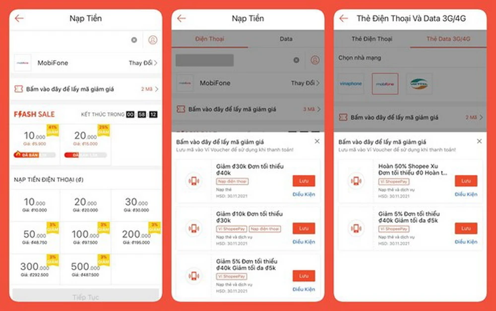 Giao diện nạp điện thoại và mua gói data ngập tràn sắc cam của voucher giảm giá cùng nhiều chương trình chiết khấu hấp dẫn