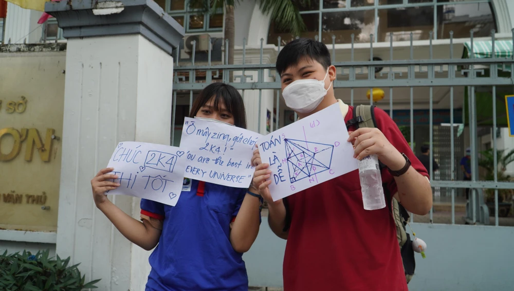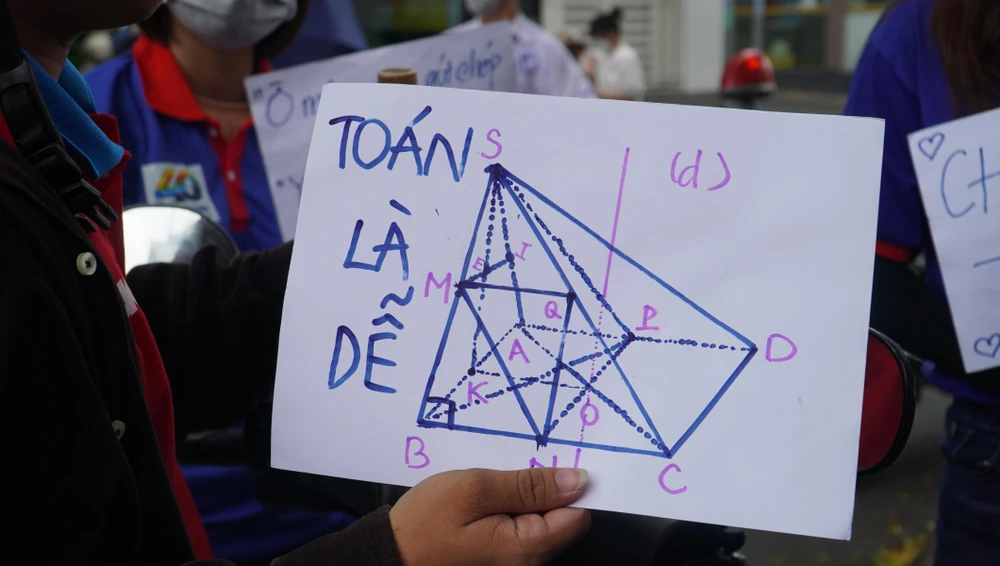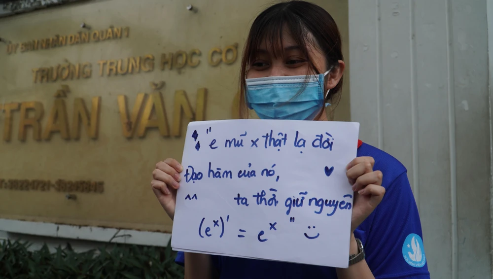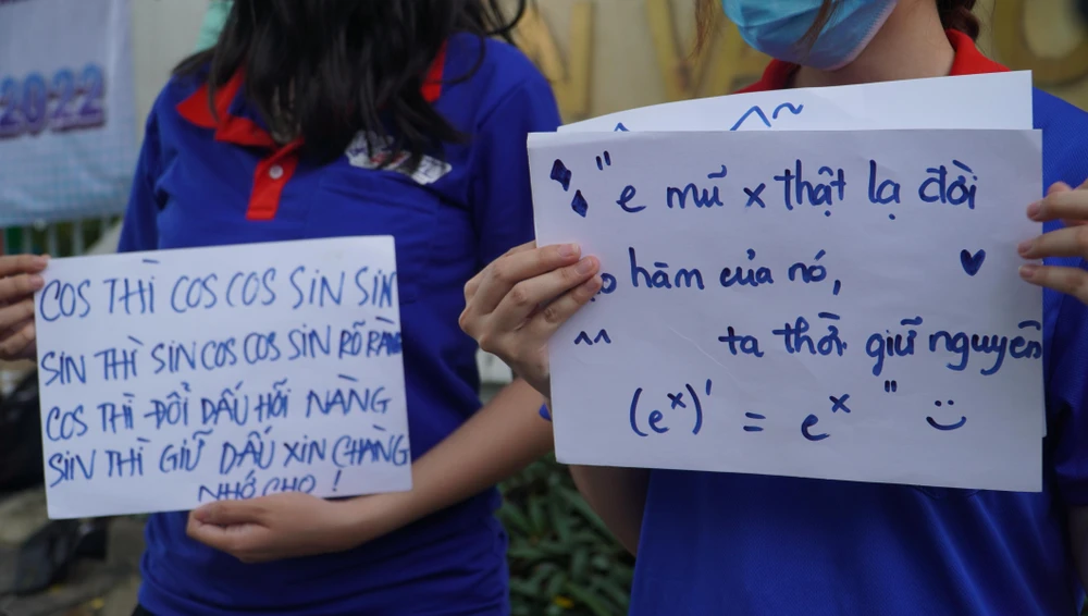 Bên cạnh đó, ngoài cổng trường THCS Trần Văn Ơn, quận 1 các bạn tiếp sức mùa thi cũng đang cổ động các thí sinh bằng những câu sologan siêu đáng yêu như "e mũ x thật lạ đời. Đạo hàm của nó, ta thời giữ nguyên...", "Câu dễ làm trước câu khó giữ nguyên", hay "toán là dễ..." khiến các thí sinh thoải mái tinh thần trước khi bước vào phòng thi.