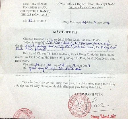 Giấy triệu tập của THA dân sự thị xã Đồng Xoài ký ngày 24-7 nhưng mời ông Chương ngày 28-4! Ảnh: NĐ