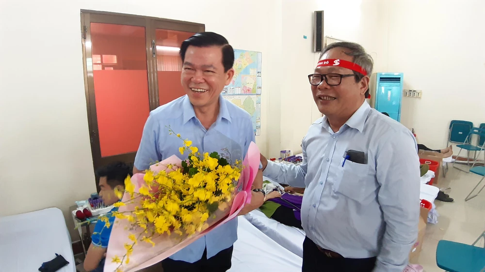 Ông Nguyễn Hồng Lĩnh, Bí thư Tỉnh ủy BR-VT cùng nhiều tình nguyện viên khác nhận hoa của Ban tổ chức sau khi tham gia hiến máu