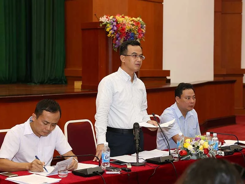 Ông Đinh Nhữ Thăng, Vụ trưởng Vụ Hợp tác quốc tế (Bộ Tài chính), chủ trì buổi họp báo về Hội nghị Bộ trưởng Tài chính APEC chiều 9-10. Ảnh: TTXVN