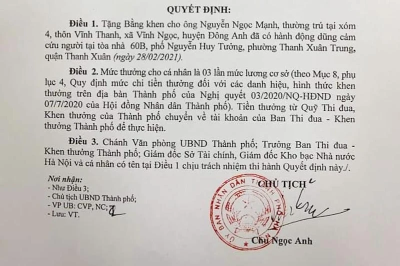 Quyết định nêu rõ: Tặng Bằng khen cho ông Nguyễn Ngọc Mạnh, thường trú tại xóm 4, thôn Vĩnh Thanh, xã Vĩnh Ngọc, huyện Đông Anh đã có hành động dũng cảm cứu người tại tòa nhà 60B, phố Nguyễn Huy Tưởng, phường Thanh Xuân Trung, quận Thanh Xuân (ngày 28/2/2021).