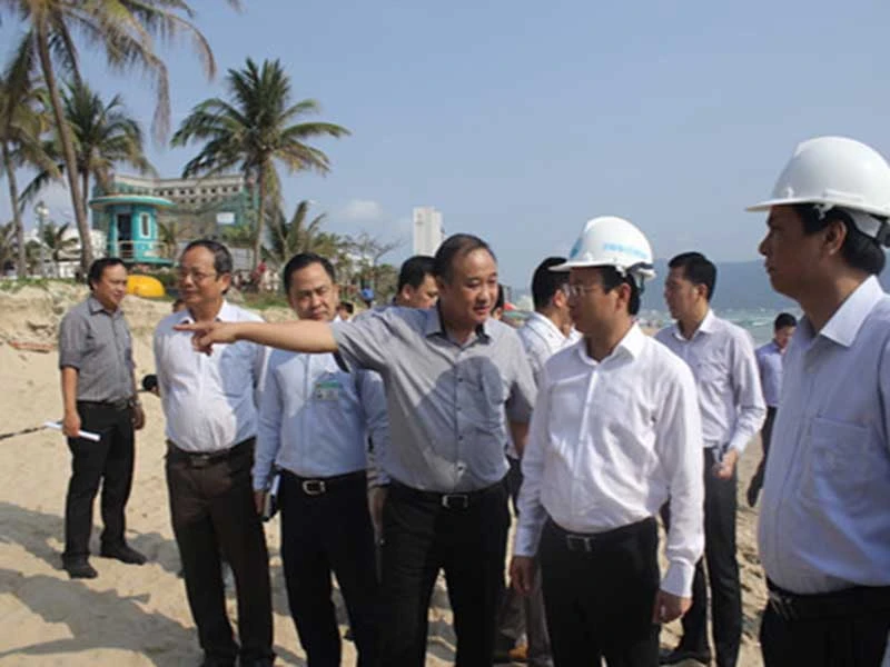 Bí thư Thành ủy Đà Nẵng Nguyễn Xuân Anh đi thị sát bờ biển. Ảnh: NGUYỄN TRI
