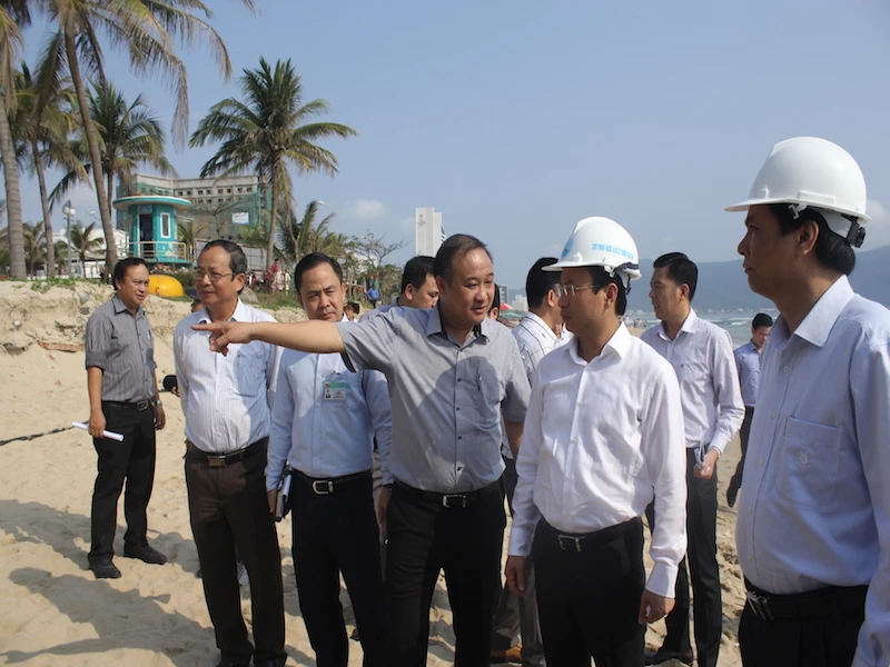 Bí thư Thành ủy Đà Nẵng Nguyễn Xuân Anh đi thị sát bờ biển. Ảnh: NGUYỄN TRI
