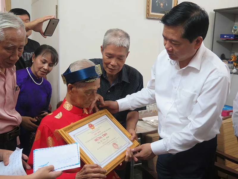 Bí thư Thành ủy TP.HCM Đinh La Thăng chúc thọ cụ Nguyễn Văn Hưu (ngụ phường Bến Thành, quận 1) 101 tuổi. Ảnh: TÁ LÂM
