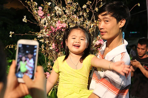 Hai bố con nhí nhảnh bên hoa anh đào. Ảnh: HOÀNG GIANG